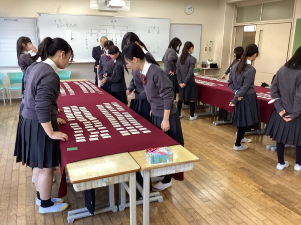 1月10日(土)午後のひととき、百人一首大会が行われました。 中1から高2まで計8組のチームが参加し、優勝は高2の太田・森谷ペアとなりました。