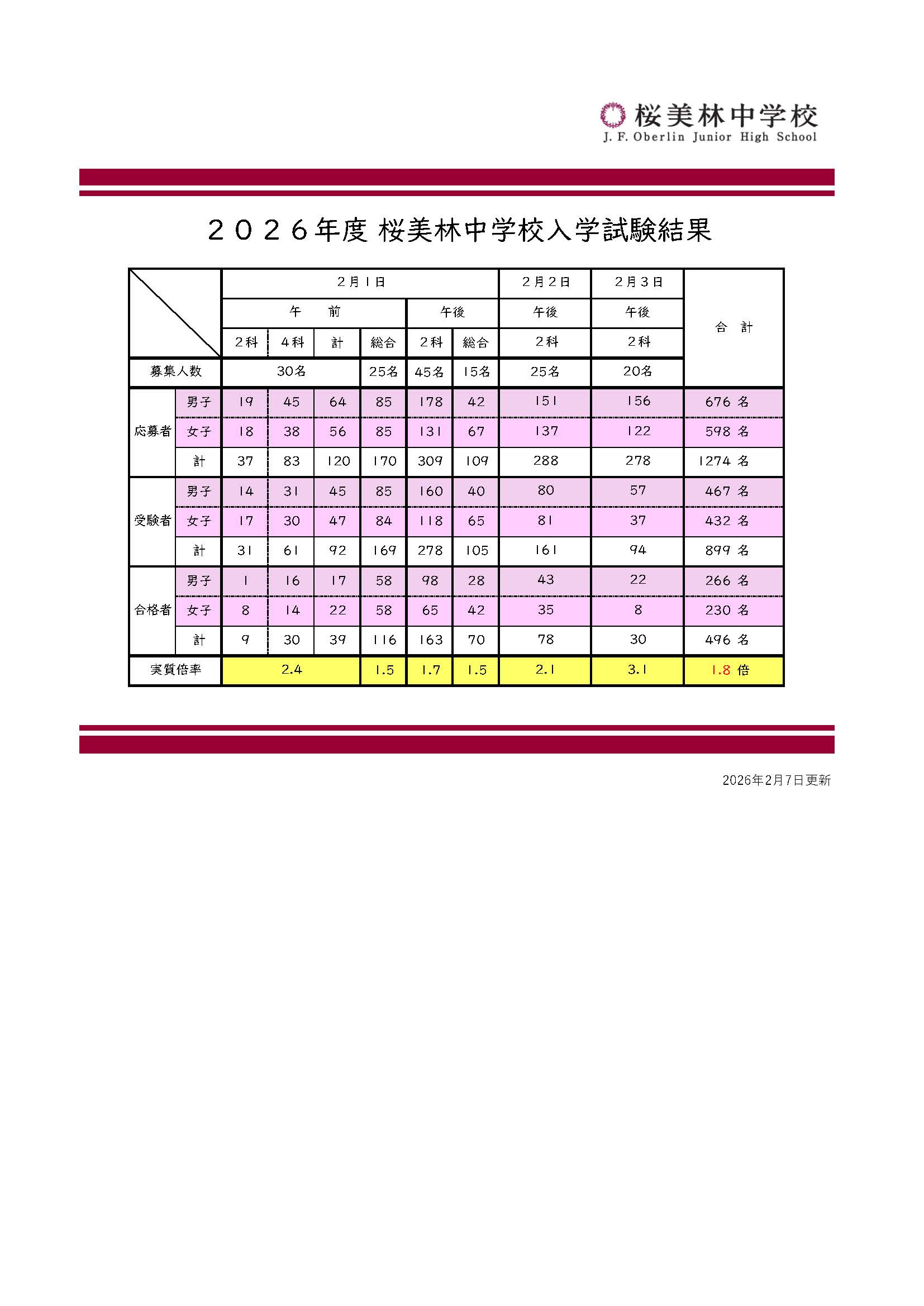 2026年度中学校入学試験結果
