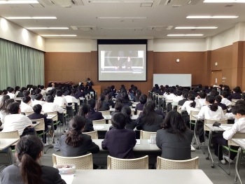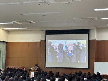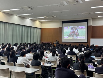 中学3年生生徒会役員の進行のもと、中学1年生に向けて、中学2、3年生が作成した部活動紹介の動画が流されました。