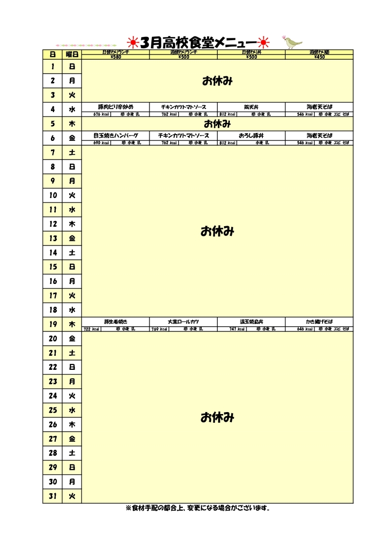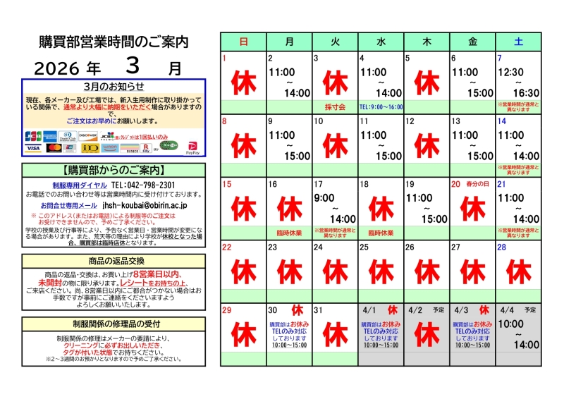 購買部利用案内(制服等の購入について)