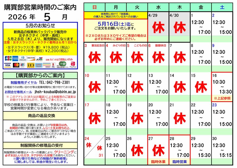 入学後の制服、体操着などの備品購入については、購買部担当業者「桜美林パートナーズ(株)」にお問い合わせください。 (制服受付専用電話 TEL:042-798-2301)