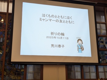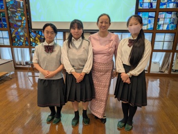 本校からも高校生の有志と教員が参加しました。今年のテーマは「ミャンマーの方々を覚えて祈る」ことでした。ミャンマーで医療活動をされているクリスチャン医師の荒川泰子さんをお招きしてミャンマーの現状と保健医療の現場の様子をお聞きしました。礼拝では玉川聖学院長の安藤理恵子先生より説教をいただきました。その後はグループに分かれてヤンゴンかるたの体験をして、共に祈りの時を持ちました。東京都内から100名近い生徒教職員が集まり、礼拝と祈りの時を持てたことに感謝しています。ミャンマーの人々の平和と健康を祈り続けたいと思います。