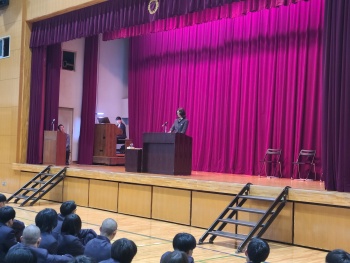 礼拝ののち、全体集会では新任教員の紹介が行われ、今年度から学びを共にする新たな先生を大きな拍手で歓迎しました。