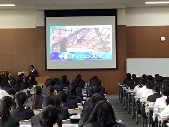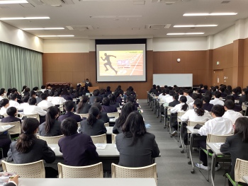 中学3年生生徒会役員の進行のもと、中学1年生に向けて、中学2、3年生が作成した部活動紹介の動画が流されました。